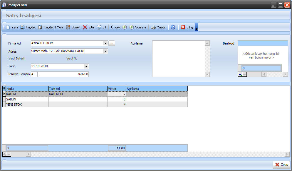 Sistem tarafından otomatik olarak bugün verilecektir.İsterseniz bu tarihleri düzeltebilirsiniz.İrsaliye seri ve numarasını istediğiniz şekilde belirleyebilirsiniz.Barkod;