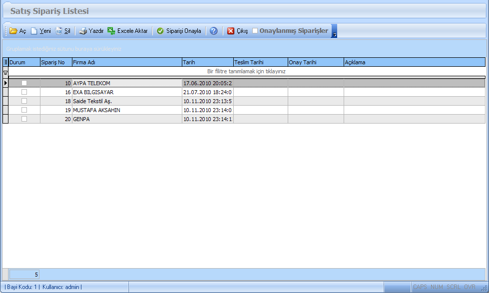 Tıkladığımız anda Satış Sipariş Listesini ekrana getirecektir.İşlemlere geçmeden önce biraz ekranı tanıyalım.